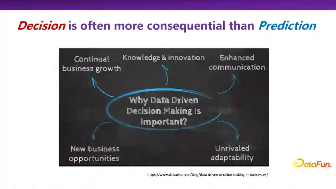 在实际的很多场景中,决策比预测更加重要。因为预测本身的目的并不只是单纯地预知未来长什么样子,而是希望通过预测去影响当下的一些关键行为和决策。 在很多领域,包括商业社会学领域,做决策非常重要,比如持续的业务增长(Continual business growth)、新商业机会发现(New business opportunity)等,如何通过数据驱动来更好地支撑最终的决策,是人工智能领域不可忽视的一部分工作。