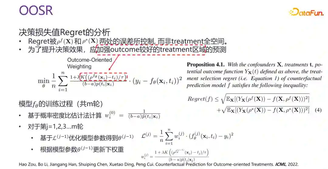 因此提出了策略优化的新方法 OOSR,目的是加强结果比较好的干预区域的预测力度和优化力度,而不是在全空间去做优化。因此在做优化时,在做面向结果的加权(outcome-oriented weighting)时,当前的干预离给定的已经训练下的最优解的距离越近,则优化力度更大。