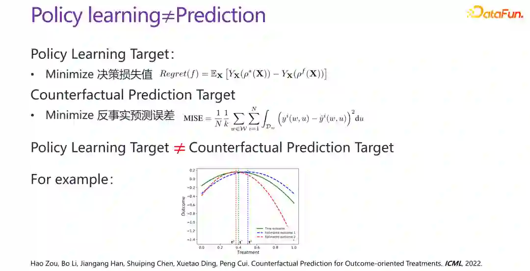 如果现在有一个反事实的个体级别的预测模型 f,即策略个体效果预测模型 f,也就是给定 xi 和 ti,就可以估计出来对应的结果,那么就可以对 T 进行遍历,t 取什么值时,f 的值最大。就相当于构造一个比较好的预测空间,在预测空间中“打哪指哪”。 但把策略优化问题退化为策略个体效果预测模型的构建,是有问题的。策略个体效果预测的目标,如前所述,实际上是相当于给定了一个干预,希望反事实预测出来的情况与真实情况的误差尽量比较小,并且对于所有给定的干预,都希望比较准确。策略优化的目标,是找到的 pf 点离真实情况上帝视角下的最优决策的结果之间的距离越小越好,并不是一个全空间的策略个体效果预测的问题,而是能不能找到离最优点比较近的区域,以及能不能准确地预测最优点。策略优化和策略个体效果预测在目标上是不一样的,存在很明显的差别。