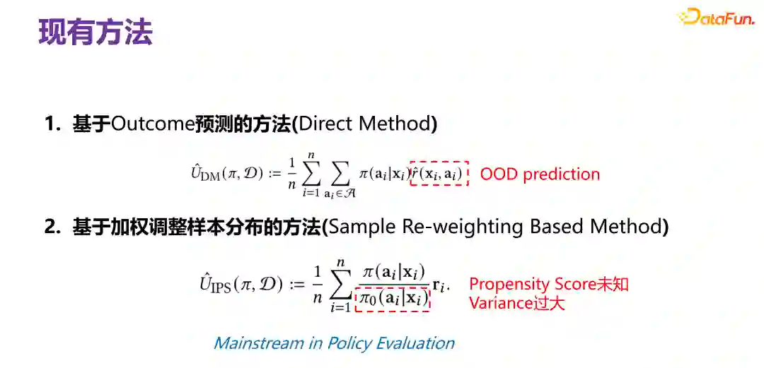 传统的策略平均效果评估方法是基于结果预测的方法(Direct Method),在新的策略(policy)下给定 xi,对于主体,建议曝光还是不曝光,即对应的行为,就要预测如果进行了曝光,最终用户会不会购买,或会不会点击,即最终获得的结果(reward)。但请注意,reward 实际上是一个预测函数(prediction function),是通过历史数据得到的。历史数据中的 x、a 和 r 的联合分布(joint distribution)实际是在 Π0 下产生的,现在换了一个 Π 所产生的数据分布,再用原来 Π0 下产生的联合分布预测模型(joint distribution prediction model)去做预测,很显然这是一个 OOD(Out-of-Distribution)问题,如果后面用 OOD 预测模型,那么数据分布偏移问题有可能得到缓解,如果用一个 ID(In-Distribution)预测模型,原则上肯定会出问题。这是传统的策略平均效果评估方法。 另外一种方法是基于因果推断的,引入了倾向指数(propensity score),其核心思想是,用原始策略下的三元组(xi,ai,ri ) 在新的策略下,到底应该使用什么样的权重去加权最终产生的结果。权重应该是给定 xi,在新策略下 xi 曝光(ai)的概率和在原有策略下 xi 进行曝光(ai)的概率之比,即在新的策略下,对一个三元组所对应的结果进行加权的一个系数。该种做法最难的地方是在原始策略下,给定 xi 后,对应 ai 的概率分布其实是不知道的,因为原始策略可能很复杂,也有可能是多个策略的叠加,并没有办法显性地刻画对应的分布,因此需要进行估算,那么就会存在估算是否准确的问题,并且该估算值在分母上,会导致整个方法的分布方差(variance)非常大。另外使用倾向指数(propensity score)的估计本身就存在问题,假设倾向指数(propensity score)的函数是线性的,还是非线性的,是什么形式,估计是否准确等等。