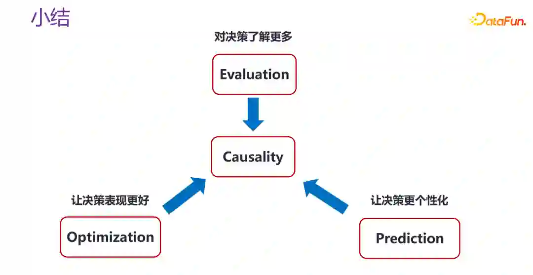 不管是做策略评估,还是策略优化、策略个体效果预测,实际上都是在利用因果关系(Causality),来对决策了解更多,让决策表现更好,或者让决策变得更加个性化。当然针对不同的场景,还有很多开放性的问题。