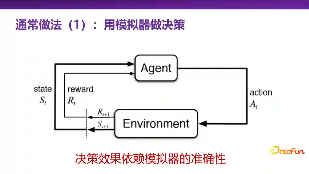 整套强化学习的决策体系在很多实际应用问题上,会被大家首先想到。但是在真实的应用场景下,使用强化学习最大的挑战是有没有一个很好的对真实场景的模拟器。模拟器的构建本身就是一项极具挑战性的任务。当然比如阿尔法狗(Alphago)象棋等游戏场景,总体上来讲规则是相对封闭的,去构造一个模拟器还是比较容易的。但是在商业上和真实生活中,大多是开放性的场景,比如无人驾驶,很难给出一个非常完备的模拟器。要构造出模拟器,就需要对该场景有非常深入的理解。因此,构造模拟器本身可能是比做决策、做预测更难的一个问题,这实际上是强化学习的局限性。