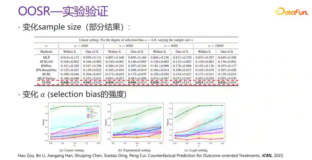 上图是 OOSR 的实验验证,可以看出,从各个角度上提升都非常明显,有几倍的提升,并且变化了 selection bias 的强度后,效果也依旧非常好。相关论文发表在 ICML 2022 [4]。