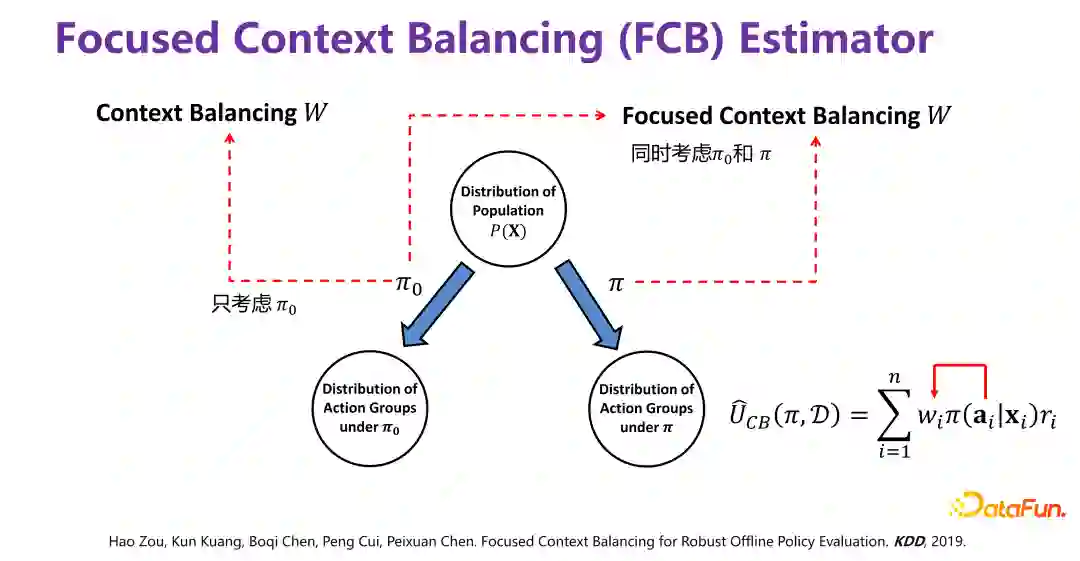 借鉴因果关系(Causality)的直接混淆变量平衡(directly confounder balancing),提出了对样本直接加权的方法,使得加权后,可以保证在各个对应行为群(action group)的分布 P(X|ai)整体上和 P(X) 是一致的。 历史数据是在给定 Π0 的情况下产生的,要去掉因 Π0 引起的分布偏差(bias),具体做法如上图所示,原始的数据分布 P(X),在 Π0 的作用下,相当于把 P(X) 划分为若干个子分布 P(X|a=1)、P(X|a=2)、P(X|a=3)、...、P(X|a=K),即不同的行为下对应 P(X) 的一个子集,是无偏的分布,每个行为群下都有因 Π0 而引起的偏差,要去掉偏差,可以通过对经 Π0 而产生的历史数据进行重加权,使得加权以后的所有子分布,都逼近原始分布 P(X),即样本直接加权。 预测一个新的策略在历史数据的前提下最终的效果会是什么样的,需要分两步进行。第一步,就是如前所述,先通过样本直接加权的方式去掉原始策略 Π0 所带来的偏差。第二步,要预测新策略 Π 的效果,也就是在新策略 Π 引起的偏差下去预估最终的效果,所以需要加上新策略 Π 引起的偏差 。