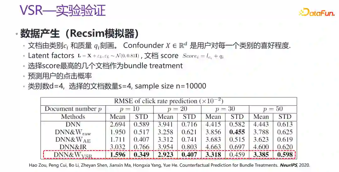 上图是新方法 VSR 的实验验证,是在一些场景下,通过 Recsim 模拟器生成部分数据,以及部分人工模拟的数据,进行验证。可以看到,在不同的 p 的取值下,VSR 的性能都相对比较稳定,相比其他方法有了很大的提升。相关论文发表在 NeurIPS 2020 [3]。