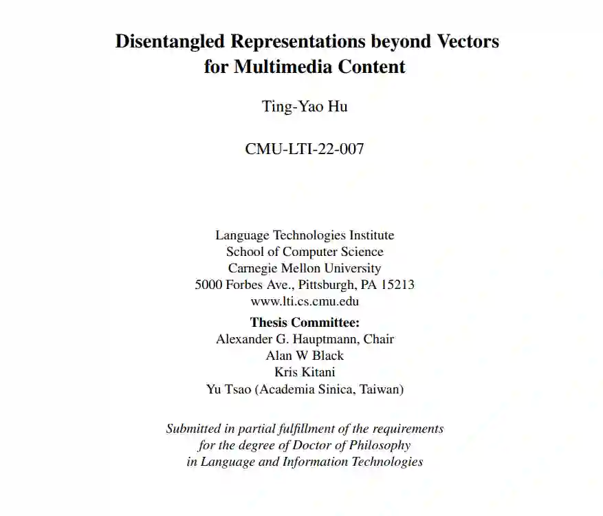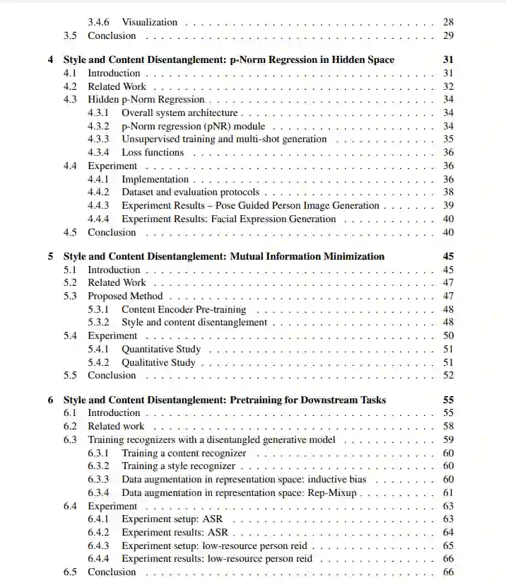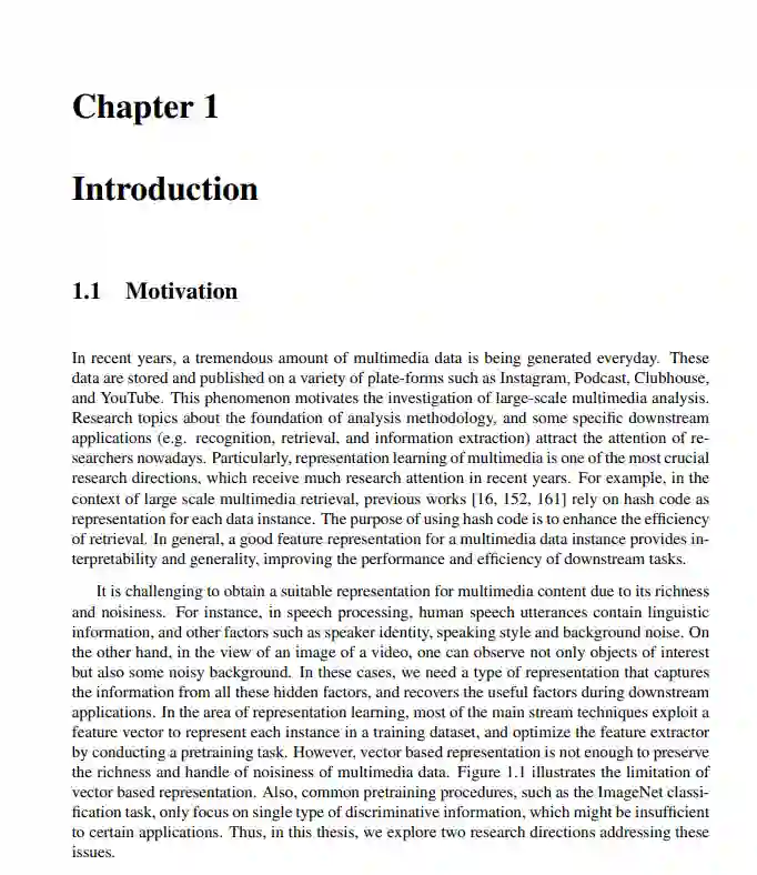 近年来,在Instagram、Podcast、Clubhouse、YouTube等各种平台上产生和发布了大量的多媒体数据。这一现象启发了大规模多媒体分析的研究工作,包括分析方法的基础,以及一些具体的下游应用(如识别、检索和信息提取)。特别是多媒体的表示学习是其中最重要的研究方向之一。一个良好的多媒体数据实例特征表示具有可解释性和通用性,可以提高下游任务的性能和效率。 由于多媒体内容的丰富性和噪声性,对其进行良好的表示具有挑战性。例如,在语音处理任务中,人类的话语包含语言信息,以及说话人的身份、说话风格和背景噪声等其他因素。在这种情况下,我们需要一种表示类型,它从所有这些因素中捕获信息,并为下游应用程序恢复有用的因素。大多数主流技术利用特征向量来表示训练数据集中的每个实例,并通过进行预训练任务来优化特征提取器。然而,基于向量的表示方法不足以保持多媒体数据的丰富度和处理噪声。此外,常见的预训练程序,如计算机视觉研究领域的ImageNet分类任务,只关注单一类型的鉴别信息,对于某些应用可能是不够的。因此,在本文中,我探索了两个研究方向来解决这些问题。 在本文的第一部分,我提出了两种新的多媒体内容表示类型:概率分布和线性子空间。与基于向量的表示方法相比,这两种方法都能较好地处理多媒体的丰富度和噪声。为了在下游任务中利用这两种表示,设计特定的算法和训练策略是必要的。在这部分论文中,我介绍了将分布和子空间表示与深度神经网络架构相结合的方法,这些方法可以端到端地进行优化。在下游任务上的实验结果表明,与主流的向量表示方法相比,本文提出的两种表示方法具有更好的性能。 在本文的第二部分,我研究了风格和内容解纠缠技术,它明确地保留了表征学习过程中多媒体内容中的不同因素。解纠缠表示提供了更好的可解释性,并允许在数据合成场景中操纵隐藏因素。基于这一动机,我提出了两种方法来有效地分离多媒体数据中的隐藏因素。第一种方法将风格和内容之间的关系建模为隐藏特征空间中的简单矩阵操作。第二种方法通过制定对抗训练准则来最小化两个隐藏因素之间的互信息。在数据合成/生成任务的定性和定量实验中,评价了两种方法的优势。此外,我进一步论证了风格和内容解纠缠技术的适用性,通过构建一个预训练框架与生成模型。具体来说,生成模型产生的合成数据可以支持语音识别、人的重新识别等下游任务的监督训练过程。此外,解缠生成过程将数据扩充的思想从原始数据空间扩展到可解释的表示空间,允许我们在下游任务中纳入更多的先验知识。