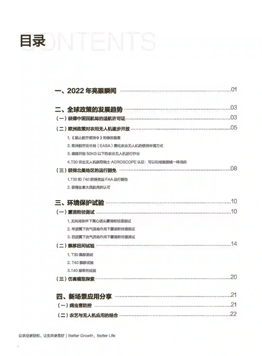 在大疆农业首次发布的《白皮书(2021)》中,就将兼顾生态环保引为企业发展的使命。2022 年,大疆农业持续深耕农业绿色发展之道,对环境保护采取了诸多举措,进行了雾滴粒径测试、飘移田间试验、仿真模型探索等多项环保实验,为后续继续研发生态友好、绿色可持续的农业科技产品奠定实验基础。大疆农业也始终保持技术的迭代升级,为农业生产推出全新的技术和产品,以更智能、更高效、更安全的方式革新农业生产方式。2022年11月,大疆农业正式发布 T50、T25农业无人飞机以及Mavic 3多光谱版无人飞机。两款全新农业无人飞机全面升级,针对肥料播撒、果树喷洒等应用场景进行多项优化,配合Mavic 3多光谱版无人飞机将农业生产管理中的作业效率、效果、智能化、稳定性、安全性等提升至全新高度。