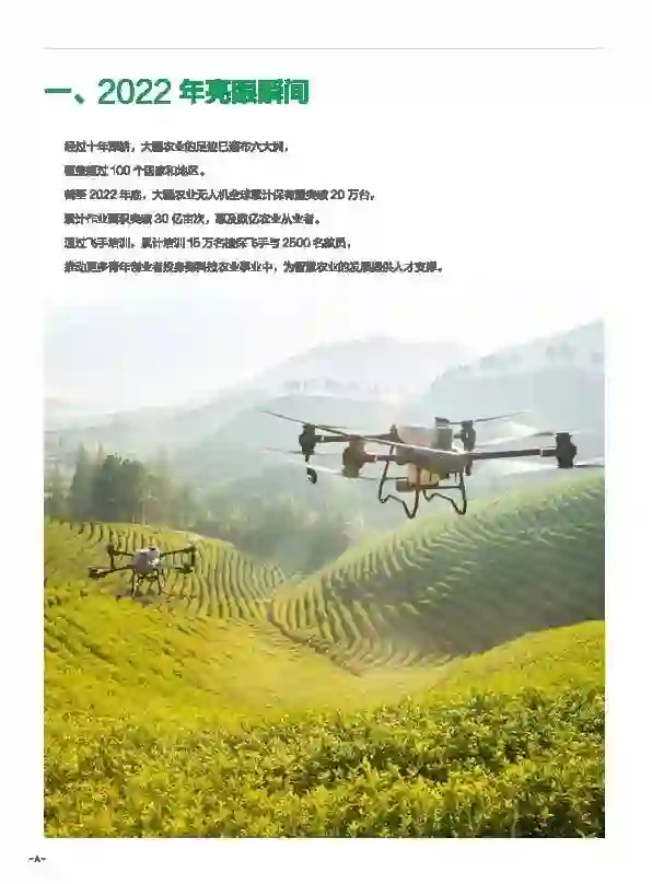 据悉,大疆农业曾在2022年6月首次发布《农业无人机行业白皮书(2021)》,《白皮书(2021)》提出农业不仅要关注效率,更要兼顾生态环保,《白皮书》则在注重农业环保的基础上,目光更加着眼全球,以更宏观、更国际化的视角解读农业无人机行业发展的现状和未来。