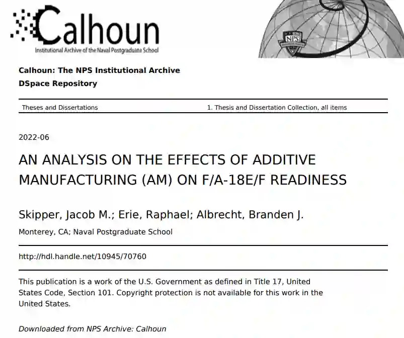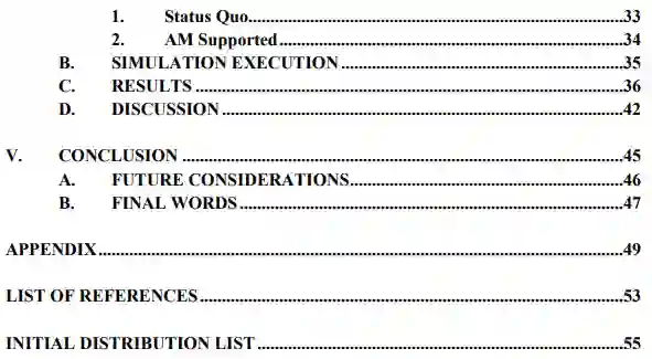 这篇研究论文重点关注波音F/A-18E和F/A-18F "超级大黄蜂 "航空库房级可修复(AVDLR)零件工艺以及增材制造(AM)对该工艺的潜在影响。研究的动机是由最近的报告所激发的,该报告表明F/A-18E/F正经历着作战准备的下降,因为与维修有关的影响增加了,与零件的可用性、长的交货时间和增加的零件故障频率有关。这项研究的目的是确定在中级维修过程中插入AM的要求,以便对F/A-18E/F的仓库级可维修部件的准备时间产生重大影响。更具体地说,这项研究分析了各种AM生产水平对整体交货时间的潜在影响。通过数学模型和基于各种假设和概率分布的模拟来促进这个研究项目的完成。进行了8次模拟,每次都有不同的AM生产时间假设。结果输出反映了19种不同的情况,模拟了0%-90%的AM在中级维护水平的生产。结果表明,如果AM生产能保持在大约30天以内,那么AM有可能减少整体预期交货时间的平均数。