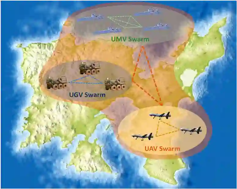 使用不同类型的飞行器组成飞行群是一种很有前景的策略(Girma 等人,2020 年),它可以利用每个成员的能力,同时最大限度地减少其局限性。这些异构蜂群以社会昆虫的集体行为为基础,通过协作实现共同目标(Jeong 等人,2019 年),同时避开禁飞区、延长电池寿命或抵御恶劣天气。
