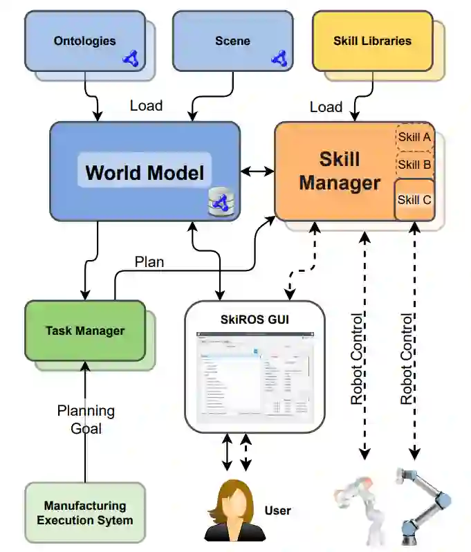 图 8:SkiROS2 的结构。世界模型(WM)存储知识和关系。任务管理器创建任务级计划。图形用户界面(GUI)降低了与系统交互的门槛。