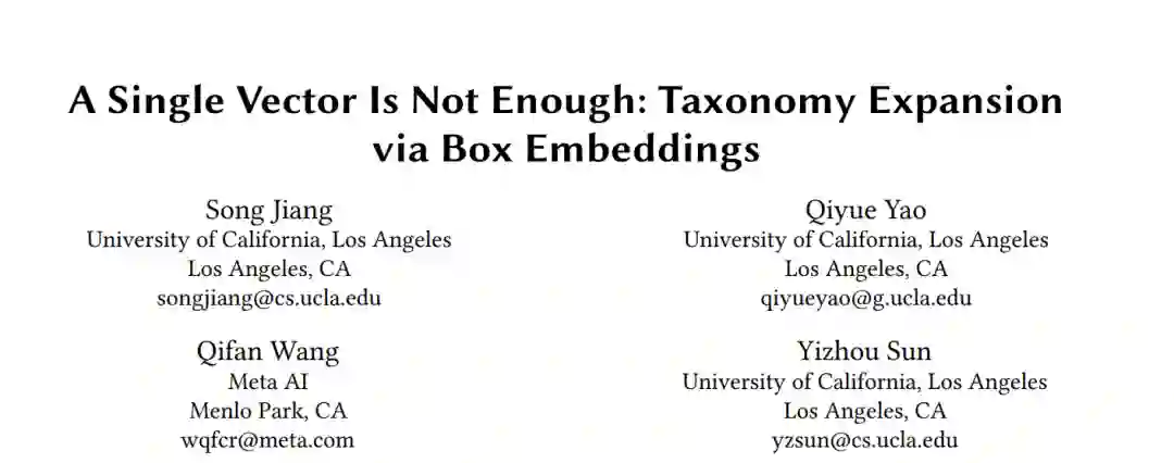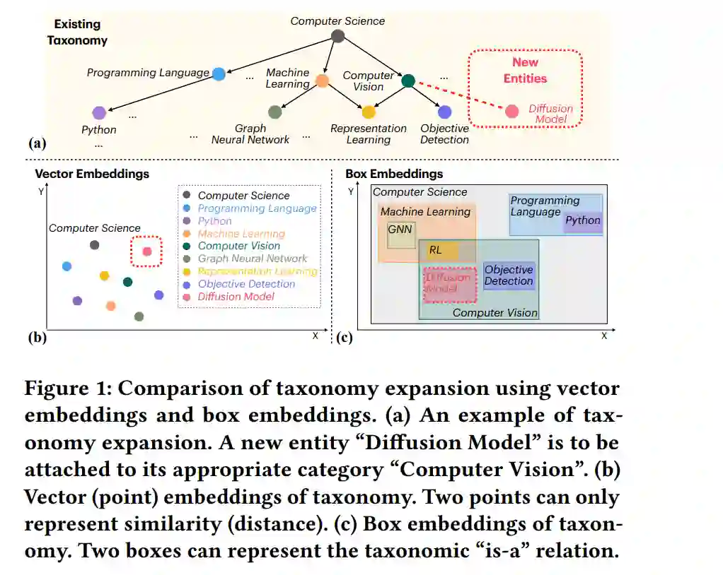 分类体系以分层方式组织知识,支持各种实用的网络应用,如在线购物中的产品导航和社交平台上的用户资料标签。鉴于新实体不断涌现,通过人工标注及时维护全面的分类体系的成本过高。因此,自动地将新实体扩展到分类体系中至关重要。现有的大多数用于扩展分类体系的方法将实体编码为向量嵌入(即单个点)。然而,我们认为向量不足以模拟分类体系中的“是一个”层次结构(不对称关系),因为两个点只能表示成对相似性(对称关系)。为此,我们建议将分类体系实体投影到盒子(即超矩形)中。两个盒子可以是“包含”、“不相交”和“相交”,因此自然地表示出不对称的分类层次结构。在盒子嵌入的基础上,我们提出了一种用于分类体系扩展的新型模型BoxTaxo。BoxTaxo的核心是为实体学习盒子,以捕捉它们的子-父层次结构。为了实现这一目标,BoxTaxo从几何和概率的联合视角优化盒子嵌入。BoxTaxo还为推理提供了一种简单自然的方法:检查给定新实体的盒子是否完全包含在现有分类体系中候选父实体的盒子内。在两个基准数据集上进行的广泛实验表明,与基于向量的模型相比,BoxTaxo具有更高的有效性。