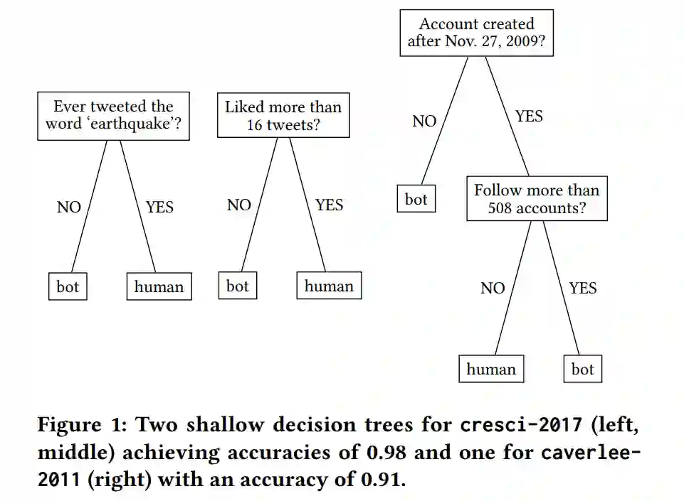 作者: Chris Hays, Zachary Schutzman, Manish Raghavan, Erin Walk, Philipp Zimmer摘要:准确的机器人检测对于在线平台的安全和完整性至关重要。这对于研究机器人在选举中的影响、错误信息的传播和金融市场操纵方面的研究也非常关键。平台部署基础设施来标记或移除自动化账户,但他们的工具和数据并未公开。因此,公众必须依赖第三方机器人检测。这些工具采用机器学习,并在现有数据集上的分类方面通常取得接近完美的性能,这表明机器人检测是准确、可靠且适用于下游应用。然而,我们提供了证据表明情况并非如此,我们发现高性能归因于数据集收集和标记的局限性,而非工具的复杂性。具体而言,我们发现简单的决策规则 —— 在少量特征上训练的浅层决策树 —— 在大多数现有数据集上实现了接近最先进的性能,而且即使将机器人检测数据集组合在一起,它们也不能很好地泛化到样本外数据集。我们的研究结果揭示了预测结果高度依赖于每个数据集的收集和标记程序,而不是机器人和人类之间的根本巟别。这些结果对于采样和标记程序的透明度以及使用现有机器人检测工具进行预处理的研究中的潜在偏见具有重要意义。