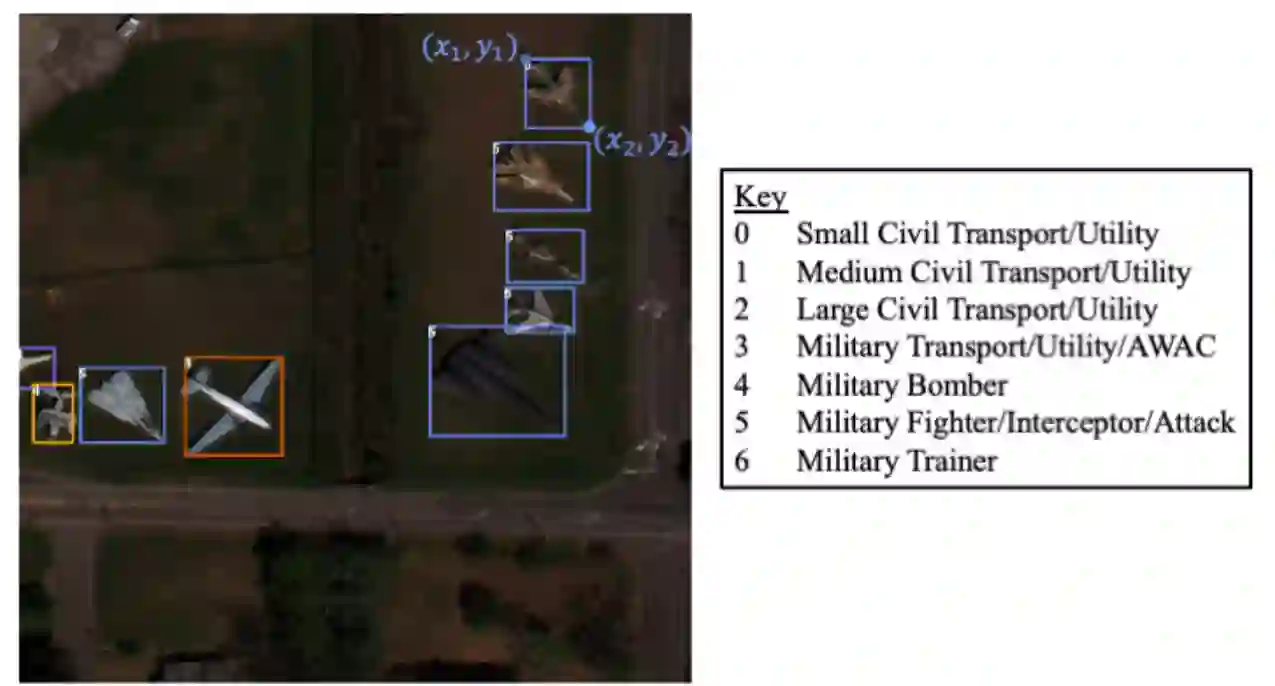 图 2.2:图像示例,标注有边界框(图片来源:RarePlanes Data Set [61])。例如,右上角的目标被标记为“军事战斗机/拦截器/攻击”类的成员。目标的位置由边界框的左上角 (x1, y1) 和右下角 (x2, y2) 坐标定义。