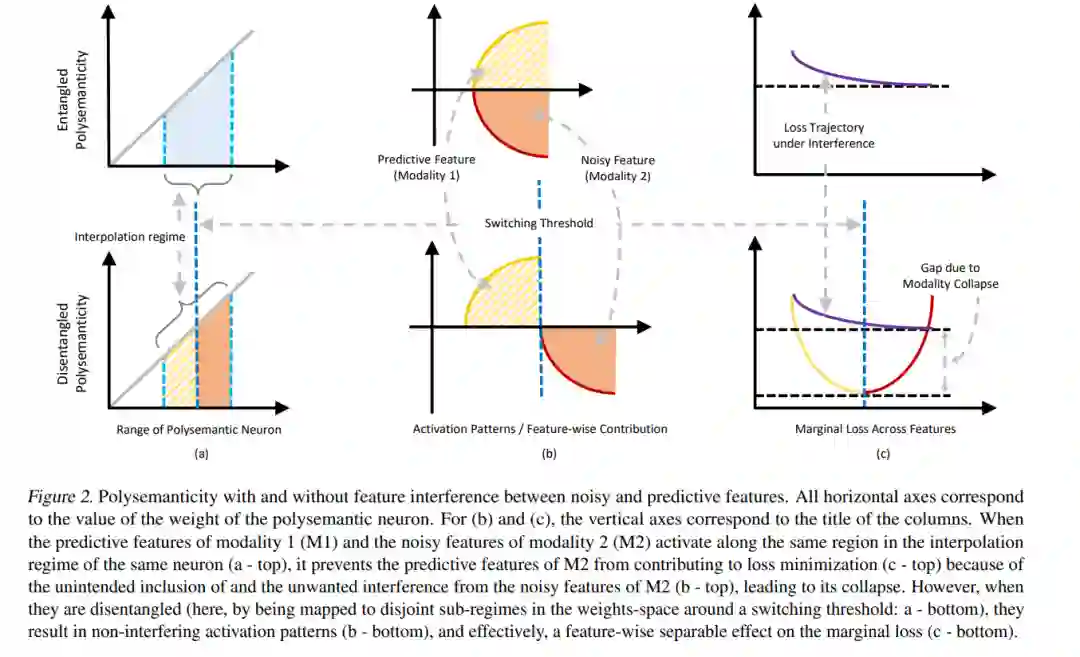 我们旨在对模态坍塌(modality collapse)这一近期观察到的经验现象进行基础性的理解。该现象指的是,在多模态融合任务中训练的模型倾向于依赖部分模态,而忽略其他模态。 我们发现,模态坍塌发生在以下情境中:某一模态中的噪声特征通过融合模块中的共享神经元,与另一模态中的预测性特征纠缠在一起,从而掩盖了前者模态中预测性特征的正向贡献,最终导致该模态在表示空间中“坍塌”。