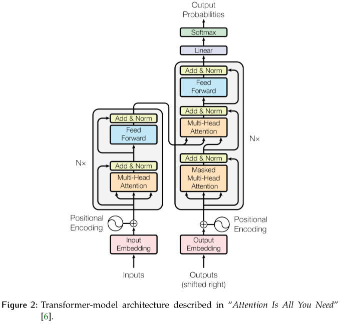 谷歌的研究人员在2017年的论文“Attention Is All You Need”[6]中发布了一种名为Transformer的新模型。简单地说,这个体系结构由自注意力层和逐点的全连接层组成(参见图2)。与我们描述的Seq2seq类似,Transformer包括编码器、解码器和最后的线性层。