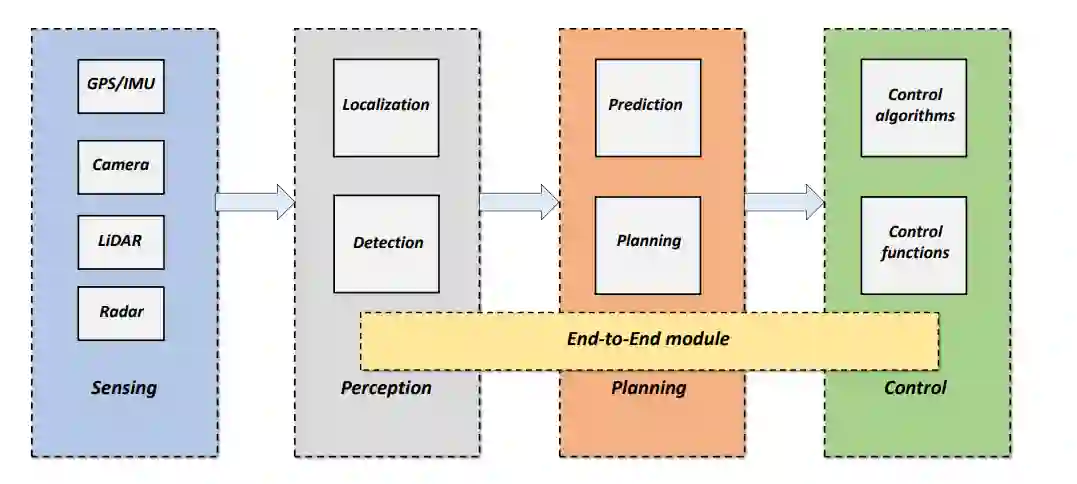 一般情况下,ADS由感知、感知、规划和控制等功能模块组成。传感模块利用相机、雷达、激光雷达等多个智能传感器对环境数据进行采集和预处理。感知模块从传感器中提取信息,以了解环境状况,如道路、障碍物、交通标志等。规划模块根据感知模块的输出,生成ADS期望遵循的最优行驶轨迹。最后,控制模块发送横向和纵向控制信号,驱动ADS沿规划轨迹运动。特别是一些ADS采用了一种特殊的端到端设计,将感知、规划和控制功能集成在一个模块中。这些模块相互协作,共同决定ADS的行为;任何一个模块的功能异常都可能导致系统故障,严重威胁ADS的安全。