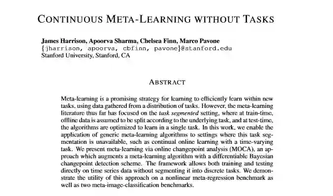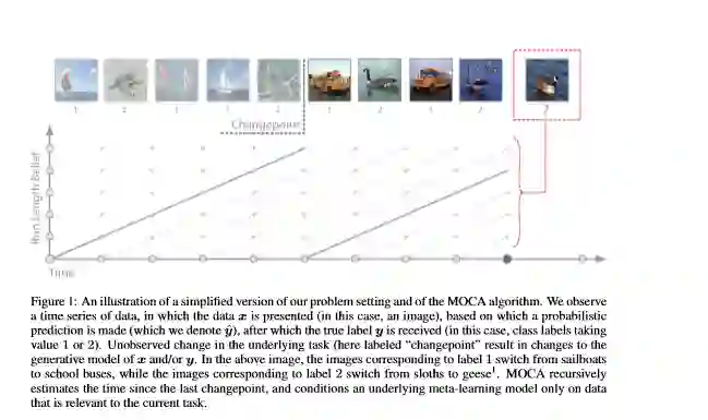 简介: 元学习可以利用从任务分配中收集的数据来有效地学习新任务。然而,迄今为止,元学习文献集中于任务分段设置,即在训练时,根据其基础任务和测试时间将“数据”汇总为多个,对算法进行了优化以在单个任务中学习。在这项工作中,我们可以将通用元学习算法应用于无法进行此任务细分的设置,例如使用时变任务进行连续在线学习。我们介绍了通过在线变更点分析(MOCA)进行的元学习,该方法利用可区分的贝叶斯变更点检测方案增强了元学习算法。该框架允许直接对时间序列数据进行培训和测试,而无需将其细分为离散任务。我们在非线性元回归基准以及两个元图像分类基准上证明了该方法的实用性。