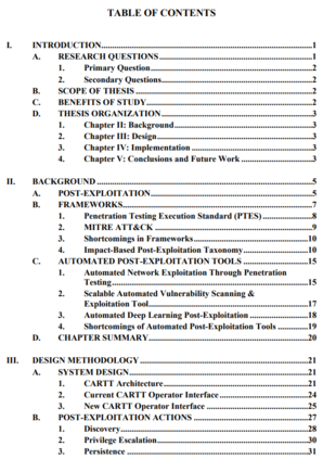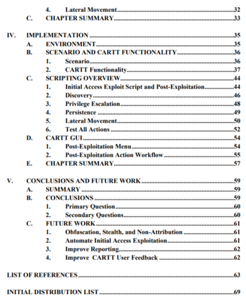 第三章介绍了CARTT是如何扩展到包括自动后开发的。这项研究利用了CARTT客户-服务器架构的集中化和模块化来扩展后开发行动。本章还详细讨论了发现、持续、特权升级和横向移动等后剥削行动。