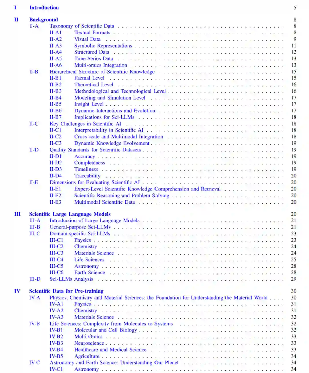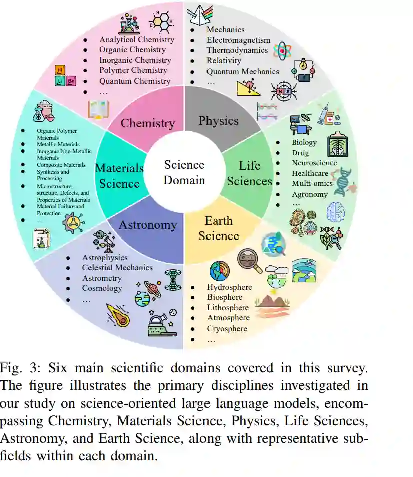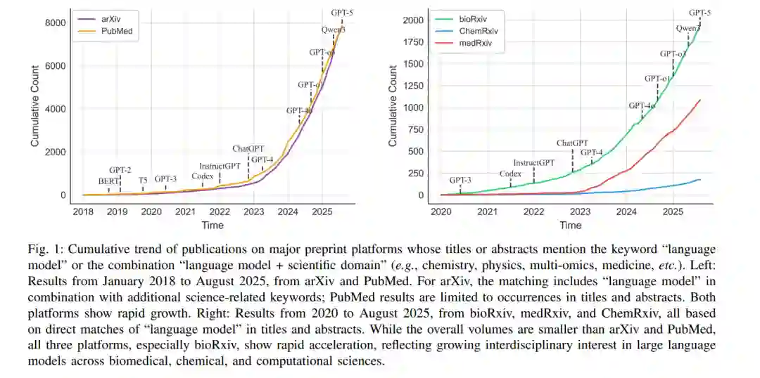 “科学是由事实构建的,正如房子是由石头砌成的。但事实的堆积并不等同于科学,正如石头的堆积并不等于房子。” ——昂利·庞加莱 大语言模型(Large Language Models, LLMs)的快速发展,引发了跨越多个领域的范式转变,通过任务自动化、生产力提升和突破性创新,展现出前所未有的变革潜力 [1]–[5](见图 1)。这些模型从根本上改变了科学研究方式,引入了一种统一的方法论,取代了传统的任务特定方法,并扩展到自然语言处理之外,涵盖分子 [6]、蛋白质 [7]、表格 [8] 以及复杂元数据等多种科学数据类型。LLMs 已经彻底革新了诸如软件工程 [2], [9], [10]、法律 [11], [12]、材料科学 [13], [14]、医疗健康 [15]–[17] 以及生物医学研究 [18] 等领域,并在数学 [19]、物理、化学 [20]、生物学 [21] 和地球科学 [22] 等学科中得到了广泛应用。