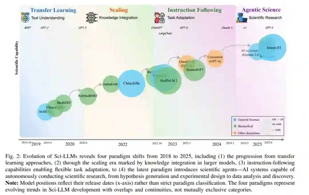 科学大语言模型(Scientific Large Language Models, Sci-LLMs)的演进,从 2018 年至 2025 年,经历了四个以数据驱动的显著阶段(见图 2)。 * 迁移学习阶段(2018–2020):这一阶段主要基于 BERT [23] 架构进行领域适配,代表性模型如 SciBERT [24]、BioBERT [25] 和 PubMedBERT [26],在大规模科学语料上继续预训练,显著提升了下游科学文本理解任务的表现。这类模型为特定任务提供了可靠但静态的概念表征,但在大规模综合与生成新的科学内容方面表现不足。 * 规模化阶段(2020–2022):参数与语料规模扩张成为核心驱动力。GPT-3 [27] 拥有 1750 亿参数,结合后续的数据/算力最优训练规则 [28], [29],展示了大规模参数扩展与多样化训练数据带来的新兴知识整合能力,从根本上改变了科学 AI 的格局。Galactica [30] 将这一经验拓展到科学领域,基于 1200 亿参数、超过 4800 万篇科学论文、教材和百科训练,设计了适配数学公式、化学结构和引用的专门分词方案。MedPaLM-2 [31] 进一步在多医学领域数据集上进行指令调优,在 USMLE 风格问题上取得超过 85% 的准确率,首次展现了可与执业医生相媲美的专家级医学推理能力。然而,Sci-LLMs 在这一阶段遭遇了“数据壁垒”:不同于通用领域可获得数千亿至数万亿规模的网络语料,高质量科学文本语料数量远小几个数量级,而丰富的原始科学数据在早期大规模尝试中却未得到充分利用。 * 指令跟随阶段(2022–2024):研究重心由模型容量转向对齐,任务适配主要通过人类反馈强化学习(RLHF)实现。典型代表包括 InstructGPT [32] 和 ChatGPT [33],使得科学任务执行更为精确。开源 LLM 架构(如 LLaMA [34]、Qwen [35]、ChatGLM [36] 和 Mistral [37])的兴起,推动了科学应用的多样性。同时,指令数据集的快速扩展催生了一系列里程碑式的 Sci-LLMs。例如,生物医学领域的 Meditron [38] 在 481 亿医学语料上预训练,展示了开源模型在医学推理中的潜力;ProteinChat [39] 基于 150 万蛋白质问答样例训练,助力蛋白质研究;LLaMA-Gene [40] 融合 DNA、蛋白质与文本数据,以及 5 亿条 DNA/蛋白任务指令样例,支持跨模态生物序列理解;跨学科模型 SciGLM [41] 在 25.4 万条精心构建的指令样例上微调,展现了跨学科知识整合能力。大量研究表明,数据规模与模型性能高度相关,例如 HuatuoGPT-II [42] 在 11 TB 医学语料上预训练,NatureLM [43] 在 1430 亿词元上预训练并结合 4510 万条指令响应对进行调优。这种“架构多样性 + 数据扩展”的双轮驱动范式,成为当前 Sci-LLM 发展的核心框架。 * 科学智能体阶段(2023–至今):AI 系统逐步具备“科学能动性”,能够规划、行动并在发现过程中迭代。已有大量工作展示了端到端的科学工作流 [44], [49],并越来越多地聚焦于多智能体 [50], [51] 与工具生态系统 [18], [52]。多智能体设计模拟实验室层级(从首席科学家到领域专家),通过正式化的会议协议与批评–迭代循环实现协作 [53], [54],从而在科学团队合作与科学规律约束下生成更具新颖性与可行性的研究构想 [55], [56]。更大规模的协作框架可管理完整的研究生命周期(问题定义、论文撰写等),并保存持久的研究产物与审计记录 [57];其具身化变体则整合机器人执行与自适应规划 [58]。与此同时,工具集成的进展主要集中在知识图谱驱动的编排 [59] 以及与数百种软件工具、数据库和实验仪器的领域级智能体交互,并配备可溯源机制 [18]。