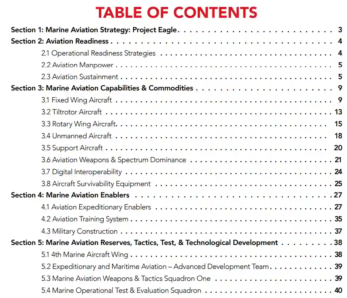 战略 “雄鹰计划”标志着海军陆战队航空兵未来的发展方向,要求重点保持和加强海军陆战队信赖和依赖的航空能力。随着多个平台的过渡,将继续对固定翼、旋转翼和无人机队进行现代化改造,以提供作战指挥官所需的持续覆盖范围和杀伤力。还将继续对海军陆战队航空后勤中队进行投资和现代化改造,以支持海军陆战队飞机大队及其作战飞机在各种气候和地点开展行动。