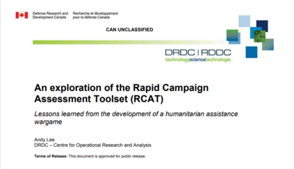 兵棋推演提供了一种探索棘手问题的方法,由于缺乏足够的信息,这些问题可能难以通过传统的分析方法进行研究。英国开发的快速战役分析工具集(RCAT)是制作兵棋推演的一种方法;本文讨论了在使用RCAT制作人道主义援助和救灾(HADR)兵棋推演过程中所获得的经验。