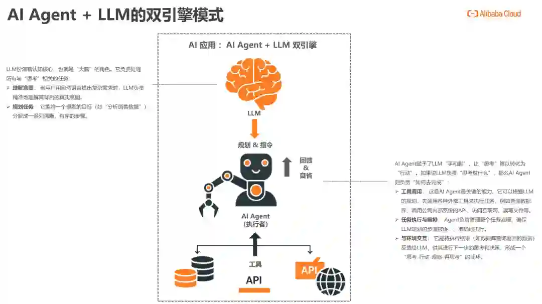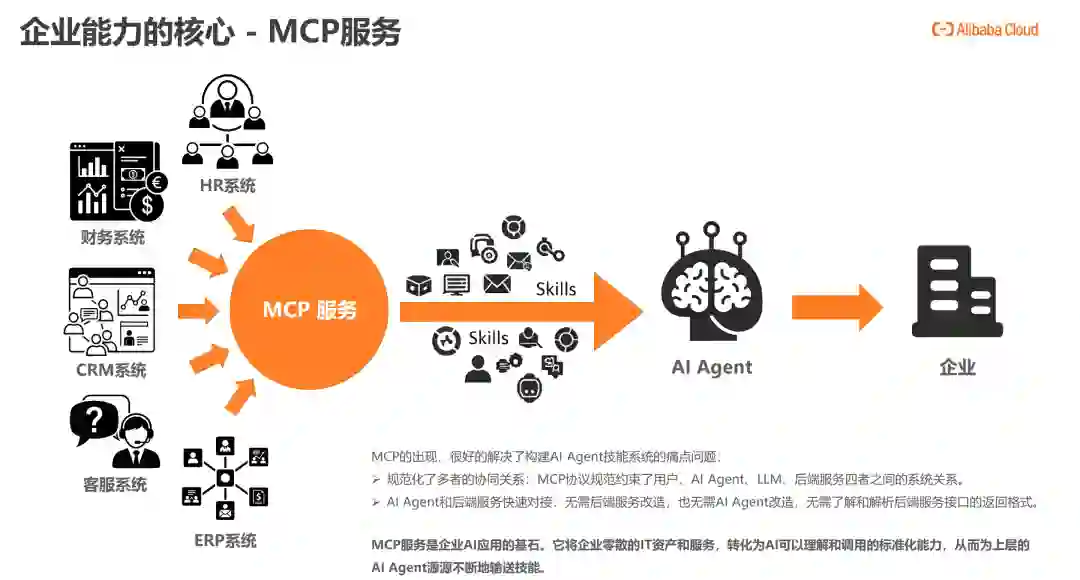 LLM扮演着认知核心,也就是“大脑”的角色。它负责处理所有与“思考”相关的任务: 理解意图:当用户用自然语言提出复杂需求时,LLM负责精准地理解其背后的真实意图。 规划任务:它能将一个模糊的目标(如“分析销售数据”)分解成一系列清晰、有序的步骤。 AIAgent赋予了LLM“手和脚”,让“思考”得以转化为“行动”。如果说LLM负责“思考做什么”,那么AIAgent则负责“如何去完成”: 工具调用:这是AIAgent最关键的能力。它可以根据LLM的规划,去调用各种外部工具来执行任务,例如查询数据库、调用公司内部系统的API、访问互联网、读写文件等。 任务执行与编排:Agent负责管理整个任务流程,确保LLM规划的步骤被逐一、准确地执行。 与环境交互:它能将执行结果(如数据库查询返回的数据)反馈给LLM,供其进行下一步的思考和决策,形成一个“思考-行动-观察-再思考”的闭环。 MCP的出现,很好的解决了构建AIAgent技能系统的痛点问题: 规范化了多者的协同关系:MCP协议规范约束了用户、AIAgent、LLM、后端服务四者之间的系统关系。 AIAgent和后端服务快速对接:无需后端服务改造,也无需AIAgent改造,无需了解和解析后端服务接口的返回格式。 MCP服务是企业AI应用的基石。它将企业零散的IT资产和服务,转化为AI可以理解和调用的标准化能力,从而为上层的AIAgent源源不断地输送技能。