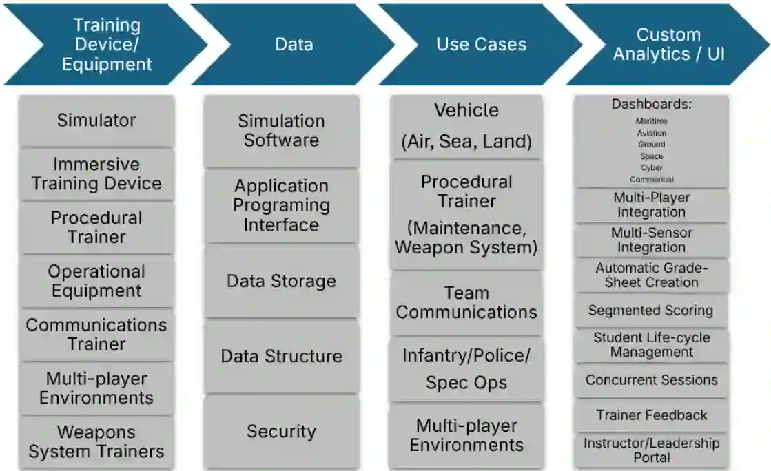 该软件解决方案使机构能监控与追踪能力。分析结果为基于能力与自适应学习模型提供信息。该方案最大化资源利用率,降低风险,并满足个体学员需求。指挥官可沿训练生命周期监控战备能力进展,追踪个体与组织训练成果,发现趋势并减少偏差。图3展示训练设备/装备、数据、应用案例及定制分析/用户界面的软件解决方案概览。