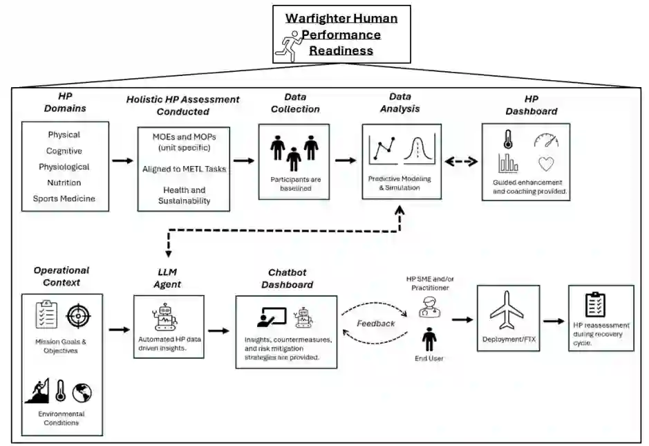 • 模拟与验证:该模型已通过旨在复制作战节奏、任务需求及环境挑战的模拟得到验证。这些模拟凸显了系统为作战人员选拔、任务分配及适应性训练方案提供可行动洞察的能力。此外,预测性反馈回路使模型能够从持续的结果中学习,不断优化其预测。