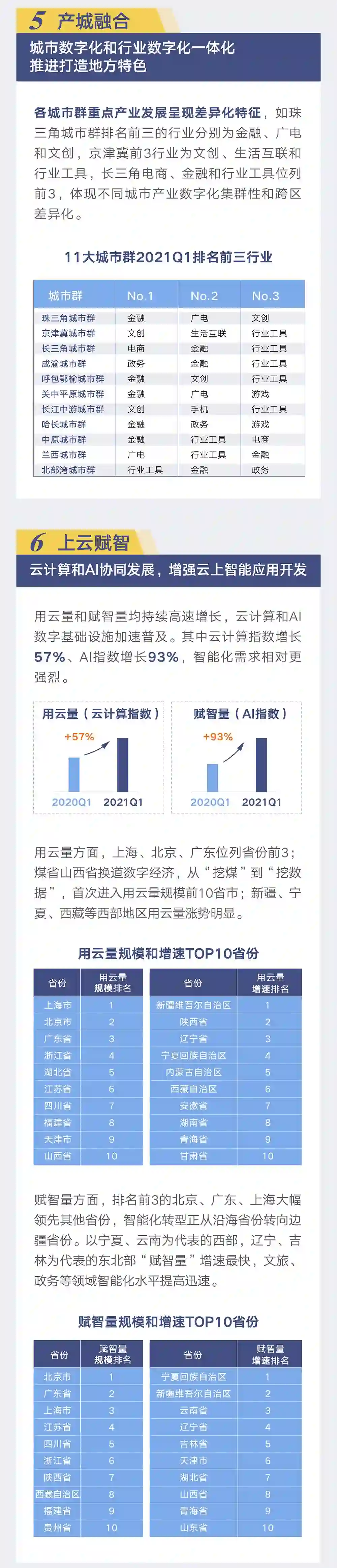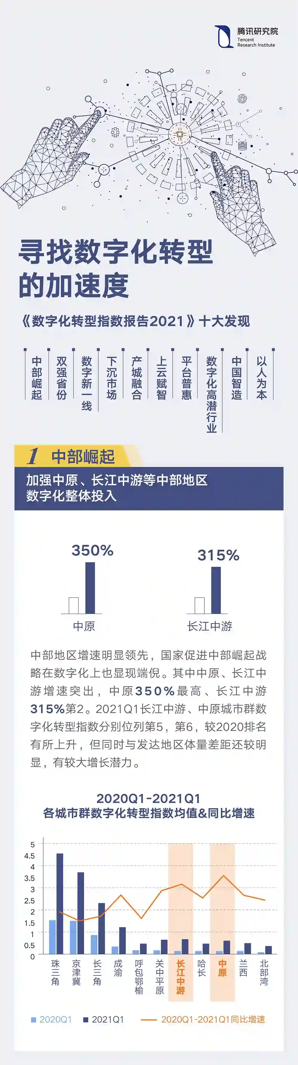 3、整体来看。 全国的数字化发展有两大特征:一是由 城市群引领 ;二是在趋势上呈现出从 东部向中西部扩散 的特征,中原、长江中游地区的增速异军突起。
