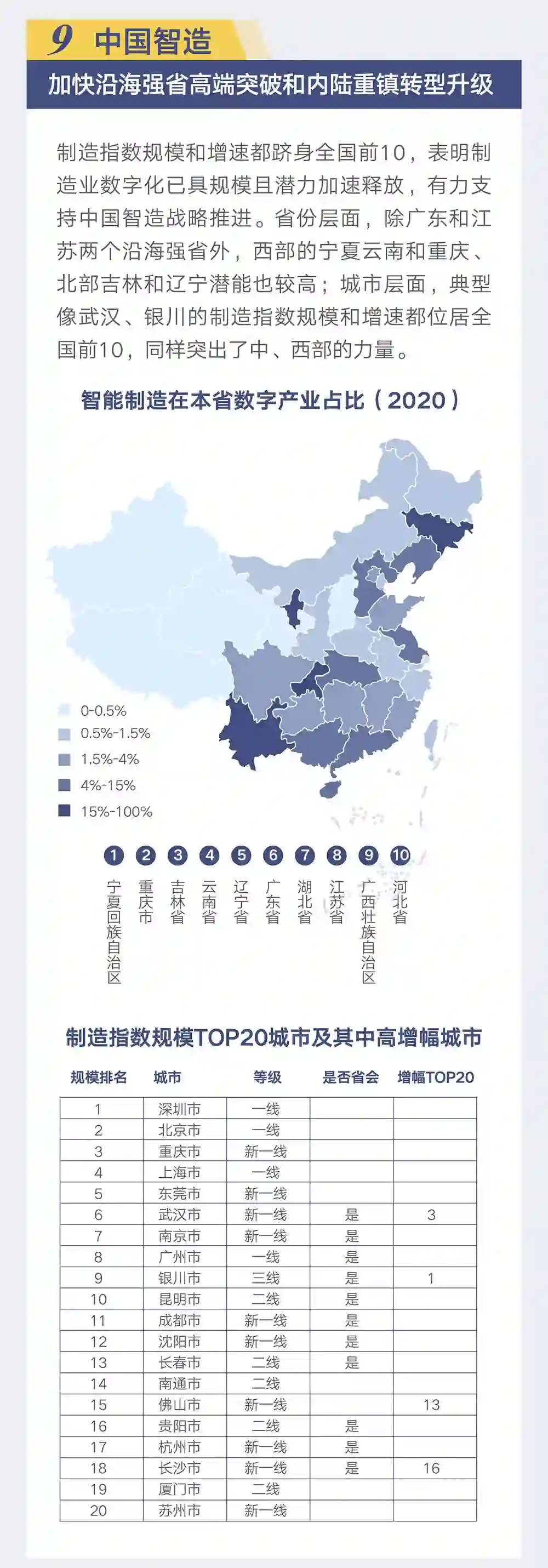 6、对于制造业。 数字化转型也在西部、北部有突出表现。宁夏、云南、重庆、吉林、辽宁等老牌工业省份通过加大智能制造建设应用,推动当地工业数字化转型。