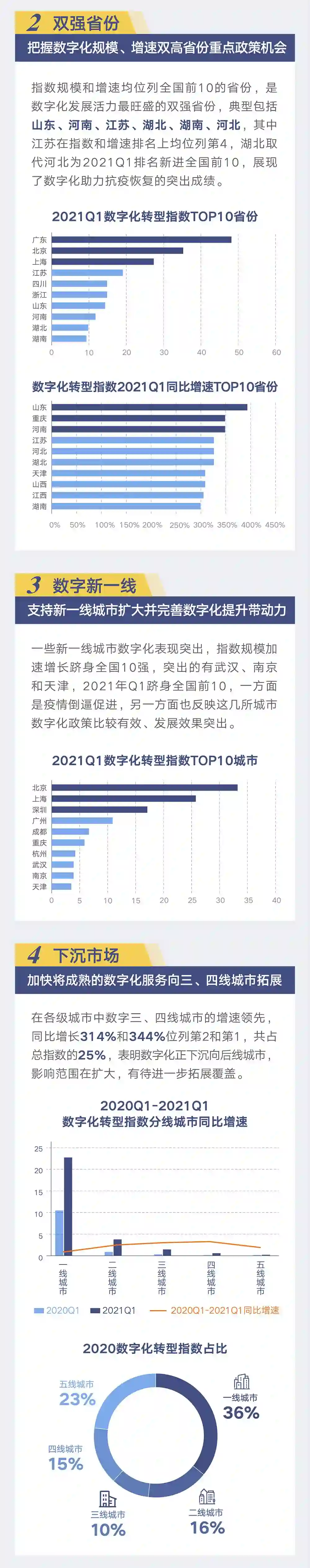 2、分项增长。 报告显示,广东、上海、北京是全国数字化转型指数排在三甲的省市。河南、湖北、湖南指数规模和增速均位列全国前十,成为“双强”省份,其中,2021年第一季度,湖北由于数字化助力抗疫恢复的突出成绩,首次跻身全国前十。行业上,电商和金融等行业数字化领先明显,是行业均值的三倍多,过去一年,传统行业的数字化转型呈现高速增长。