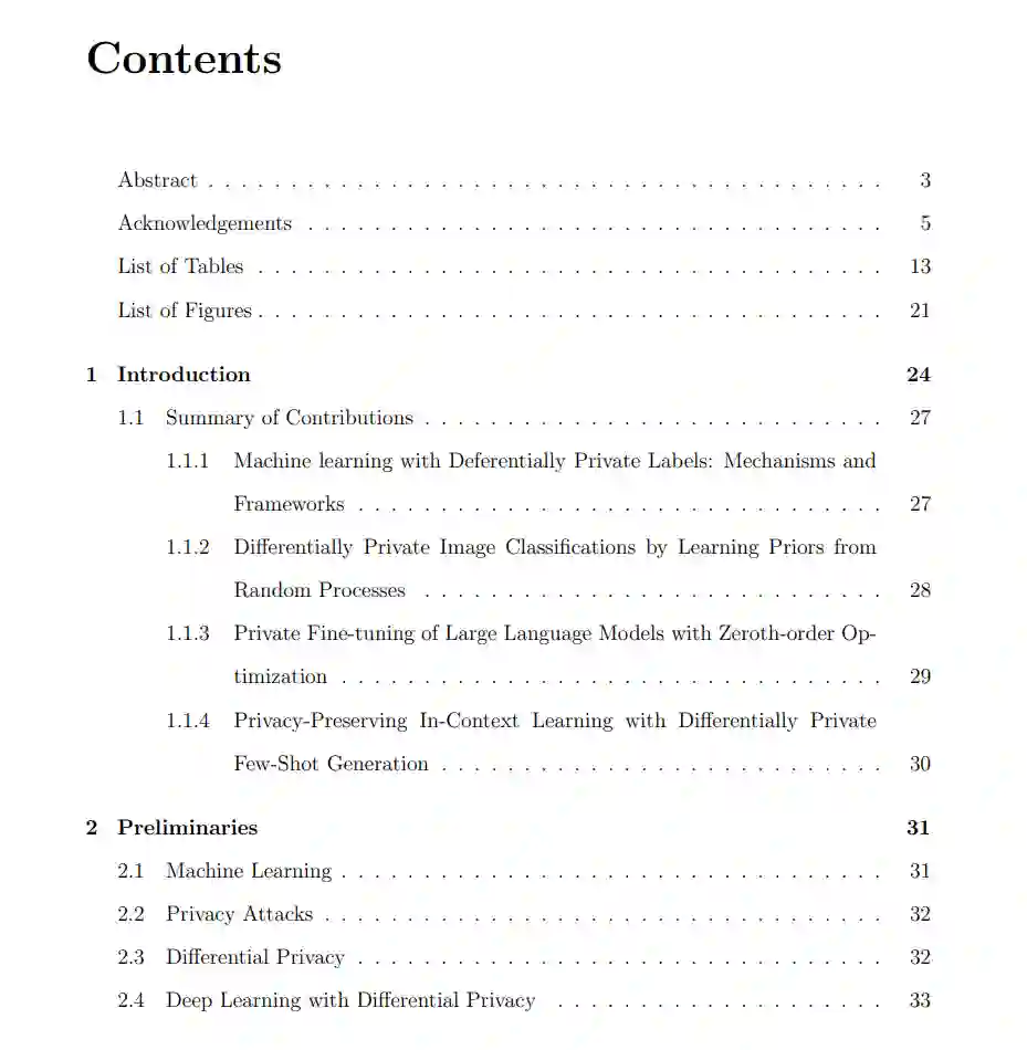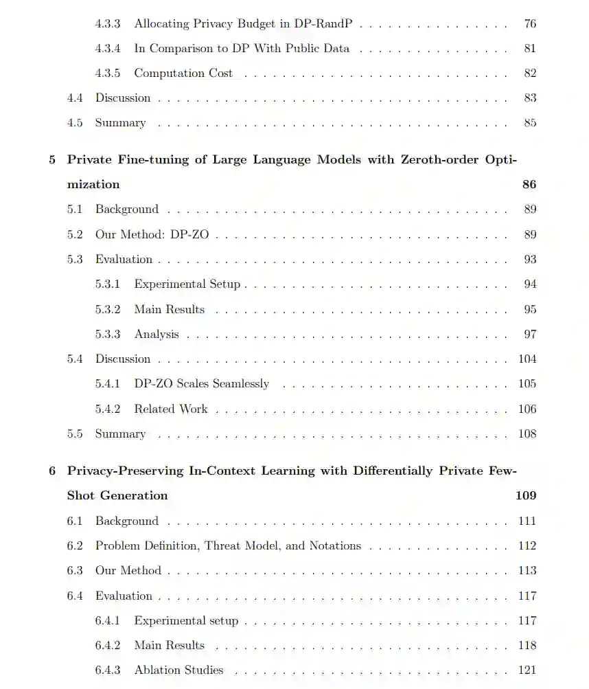第三,我们研究了零阶优化的私有化。零阶优化已被证明在微调大型语言模型时与 SGD 性能相当,我们提出了 DPZO。我们的关键见解是,在零阶优化中,从私有数据中派生的信息仅为一个标量。因此,我们只需对这个标量进行私有化。这种方法隐私友好,因为我们只需为标量添加噪声,而不是对高维梯度加噪。第四,对于差分隐私的合成数据生成,我们研究了在不进行微调的情况下,仅通过访问大型语言模型 API 来私有地生成数据。我们提出的方法可以为大型语言模型中的上下文学习提供隐私保护,同时支持无限查询。 综上所述,本论文探讨了如何在差分隐私机器学习中有效地从数据中学习并生成数据,并提供了在实践中设计隐私保护机器学习模型的方向。
