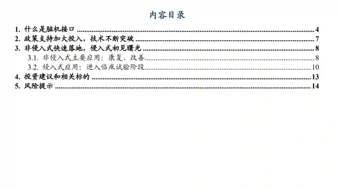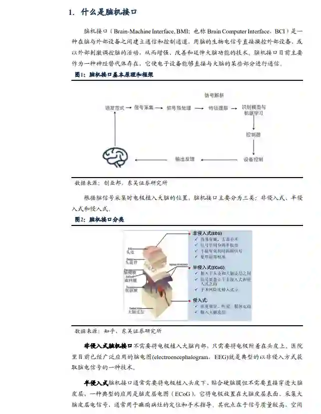 脑机接口使电子设备能够直接与大脑的某些部分进行通信:脑机接口是一种在脑与外部设备之间建立通信和控制通道,用脑的生物电信号直接操控外部设备,或以外部刺激调控脑的活动,从而增强、改善和延伸大脑功能的技术。根据脑信号采集时电极植入大脑的位置,脑机接口主要分为三类:非侵入式、半侵入式和侵入式。我国脑机企业目前大多选择非侵入式采集技术路线。对于侵入式脑机设备,目前都处在临床性研究和动物实验阶段。 政策支持加大投入:中国对脑机接口重视程度进一步提升。2024年1月,工信部等七部门发布《关于推动未来产业创新发展的实施意见》,将脑机接口列为十大创新标志性产品,未来将围绕脑机接口等专业领域制定专项政策文件,提出要突破脑机融合、类脑芯片、大脑计算神经模型等关键技术和核心器件,研制一批易用安全的脑机接口产品。 非侵入式商业化快速落地,据Precedence Statistics数据显示,2023年全球脑机接口市场规模为23.5亿美元,预计2033年达到108.9亿美元,2023-2033年复合增长率为16.55%。截至2021年,脑机接口在军事上的应用已占全球脑机接口总应用的25%,脑机接口研究战略意义凸显。目前脑机接口主要落地为非侵入式的相关应用。一些用于提升注意力、改善睡眠等的头戴式设备,以及用于医疗康复控制外骨骼的设备,已经实现了商业化落地,非侵入式脑机接口产品的市场空间非常大。我们测算在1%市场渗透率情况下,仅睡眠仪这一品类未来潜在空间就有望超过150亿元。 侵入式进入临床试验阶段,有望迎来密集催化:侵入式脑机接口的研发已经进入临床试验阶段,技术路线较多,海外新一代的植入方案以Neuralink的柔性电极方案、Synchron的血管内植入方案为主,目前均已进入临床试验阶段。2024年7月,马斯克概述了Neuralink的目标,即到2026年植入1000个大脑芯片。国内也已经同步开始推进,2024年11月,博睿康与清华大学生物医学工程系洪波教授团队合作研发的脑机接口产品NEO在复旦大学附属华山医院完成了全国第三例、上海第一例临床试验植入手术。团队预计2025年将在全国10个中心开展30-50例脑机接口临床试验,产业有望迎来密集催化。