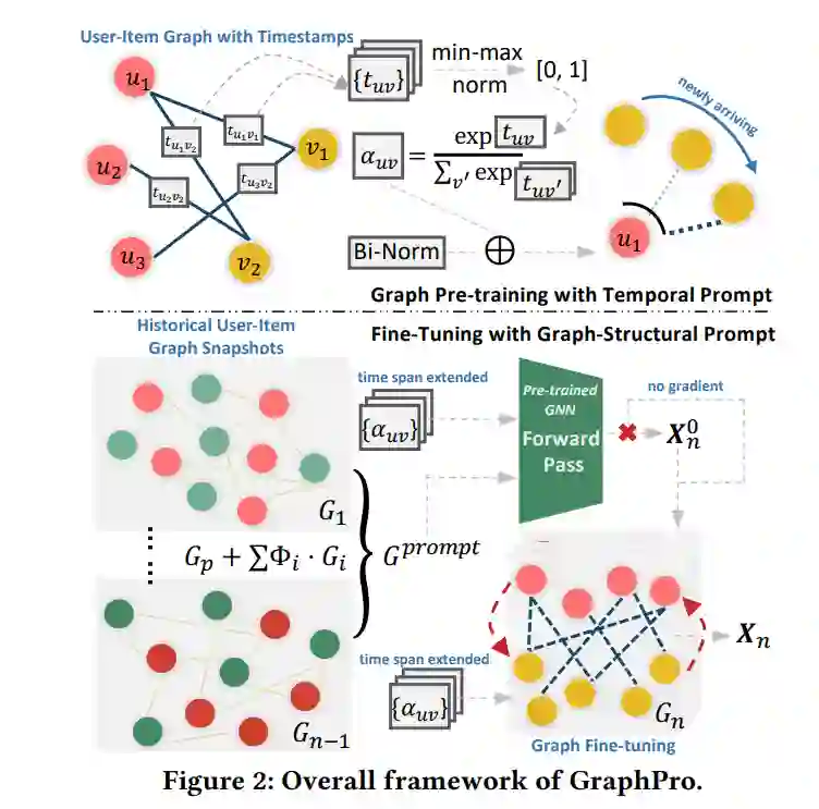 GNN(图神经网络)基础的推荐系统在捕捉复杂的用户-物品交互方面表现出色,通过多跳消息传递实现。然而,这些方法往往未能考虑到用户-物品交互的动态特性,导致在适应用户偏好变化和新数据分布方面面临挑战。因此,它们在真实世界动态环境中的可扩展性和性能受到限制。在我们的研究中,我们引入了GraphPro,一个将动态图预训练与提示学习以参数高效的方式结合起来的框架。这种创新的结合使得GNN能够熟练掌握持久的用户偏好和短暂的行为变化,从而提供精确且最新的推荐。GraphPro通过将时间提示机制和图结构提示学习机制整合到预训练的GNN架构中,解决了用户偏好变化的问题。时间提示机制将时间相关信息印刻到用户-物品交互上,使模型能够固有地吸收时间动态,而图结构提示学习机制允许将预训练的洞见应用于新的行为动态,而无需持续的重训练。我们还引入了一个动态评估框架,用于推荐以更好地反映现实世界情况并缩小线下-线上差距。我们的全面实验,包括在大规模工业环境中的部署,证明了GraphPro与各种领先推荐器的无缝插拔扩展性,凸显了GraphPro在有效性、鲁棒性和效率方面的优越性。我们的GraphPro实现细节和源代码可在https://github.com/HKUDS/GraphPro 仓库中获得。