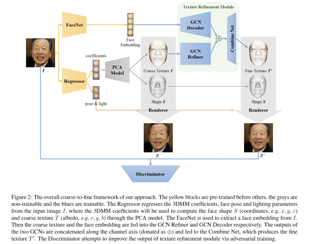 摘要:基于三维形变模型(3DMM)的方法在从单视图图像中恢复三维人脸形状方面取得了很大的成功。然而,用这种方法恢复的面部纹理缺乏像输入图像中表现出的逼真度。最近的工作采用生成网络来恢复高质量的面部纹理,这些网络是从一个大规模的高分辨率脸部纹理UV图数据库中训练出来的,这些数据库很难准备的,也不能公开使用。本文介绍了一种在无约束条件下捕获(in-the-wild)的单视图像中重建具有高保真纹理的三维人脸形状的方法,该方法不需要获取大规模的人脸纹理数据库。为此,我们提出使用图卷积网络来重建网格顶点的细节颜色来代替重建UV地图。实验表明,我们的方法可以产生高质量的结果,并且在定性和定量比较方面都优于最先进的方法。