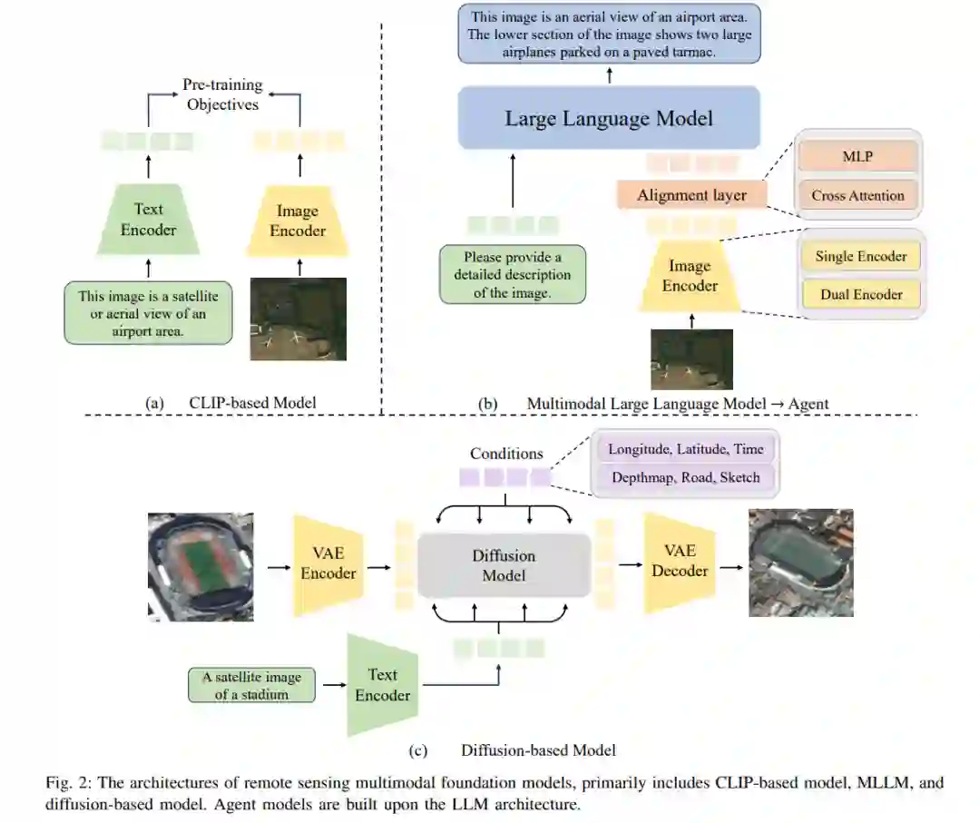 遥感基础模型(尤其是视觉与多模态模型)的快速发展,显著提升了智能地理空间数据解译的能力。这些模型融合了光学、雷达、激光雷达(LiDAR)影像以及文本与地理信息等多模态数据,从而实现对遥感数据更全面的分析与理解。多模态融合技术能够提升目标检测、土地覆盖分类和变化检测等任务的性能,而这些任务往往因遥感数据的复杂性和异质性面临挑战。然而,尽管取得了这些进展,仍存在若干关键问题:数据类型的多样性、大规模标注数据集的必要性,以及多模态融合技术的复杂性,均对模型的实际部署构成显著障碍。此外,训练和微调多模态模型的高计算需求,进一步增加了其在遥感影像解译任务中的应用难度。