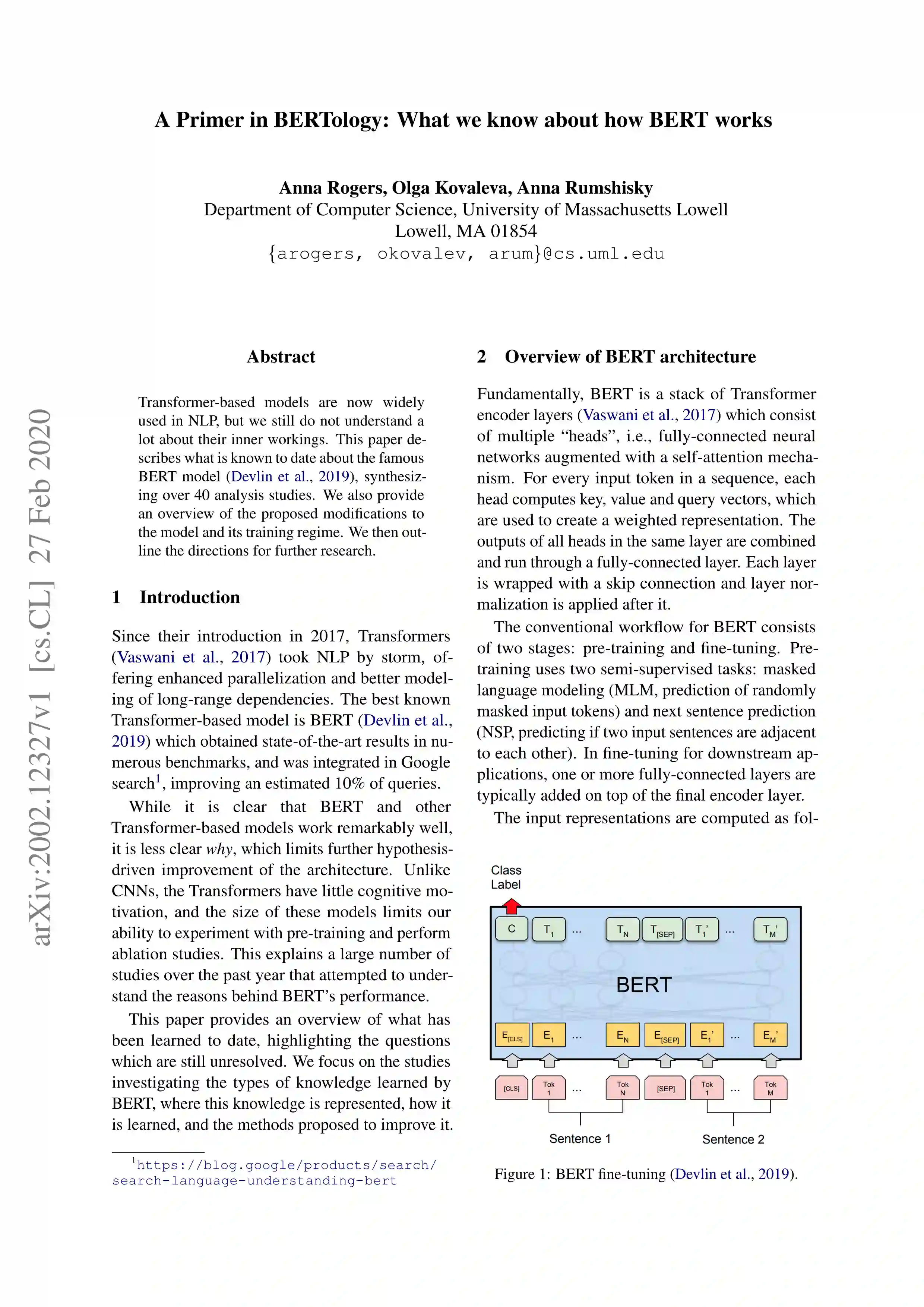 基于Transformer的模型目前在NLP中得到了广泛的应用,但我们对它们的内部工作原理仍然知之甚少。本文综合了40多项分析研究,对著名的BERT模型(Devlin et al 2019)的已知情况进行了描述。我们还提供了对模型及其训练机制的拟议修改的概述。然后我们概述了进一步研究的方向。
