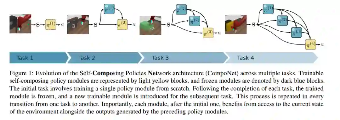 本研究提出了一种可增长且模块化的神经网络架构,用于持续强化学习,能够自然地避免灾难性遗忘与任务间干扰。该架构中每个模块的结构支持将以往策略与自身内部策略有选择地组合,从而加速当前任务的学习过程。与以往的可增长神经网络方法不同,我们证明了所提出方法的参数数量随任务数量呈线性增长,且在扩展规模的同时不牺牲模型的可塑性。
