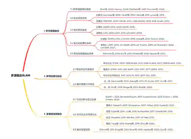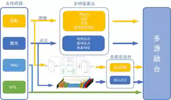 同时定位与地图构建(Simultaneous Localization and Mapping, SLAM)技术自Smith(1986)提出以来,经过三十五年的发展,已取得众多优秀的研究成果。它所关注的问题是载有传感器的机器人如何在未知环境中定位并构建出环境地图,是机器人感知自身状态和外部环境的关键技术,在现实生活中实现了大规模的应用,如虚拟现实、增强现实、混合现实、自动驾驶、服务机器人等,且在向工业界稳定过渡。 SLAM的发展经历了三个阶段:第一阶段为早年的“经典”时期,主要完成了SLAM的概率解释,如基于扩展卡尔曼滤波器、粒子滤波器和极大似然估计的方法;第二阶段为“算法分析”时期,主要研究SLAM的基本性质,如收敛性、一致性、可观测性和稀疏性;第三阶段为当前的“鲁棒感知”时期,主要解决复杂环境下的适应性问题。面对日趋复杂的应用场景,设计SLAM算法应统筹兼顾,有针对性地对算力、精度、鲁棒性等进行取舍。