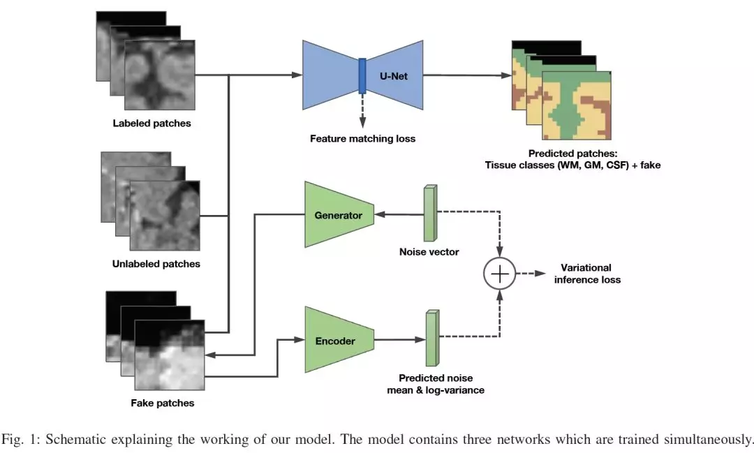 摘要:我们解决了在极少数标记示例可供训练的情况下分割三维多模态医学图像的问题。利用最近成功的对抗学习进行半监督分割,我们提出了一种基于生成对抗网络(GAN)的新方法来训练具有标记和未标记图像的分割模型。该方法通过学习识别生成网络中获得的真假patch,来防止过拟合。我们的工作扩展了目前的专注于二维单模态图像对抗性学习方法到更具挑战性的三维体多模态。针对iSEG-2017和MRBrainS 2013数据集的脑MRI分割问题,对该方法进行了评估。与在完全监督下训练的最先进的分割网络相比,性能有了显著的提高。此外,我们的工作提供了对半监督分割的不同GAN架构的综合分析,显示了最近的技术,如特征匹配,以产生比传统对抗训练方法更高的性能。我们的代码可以通过https://github.com/arnab39/FewShot_GAN-Unet3D公开获取。