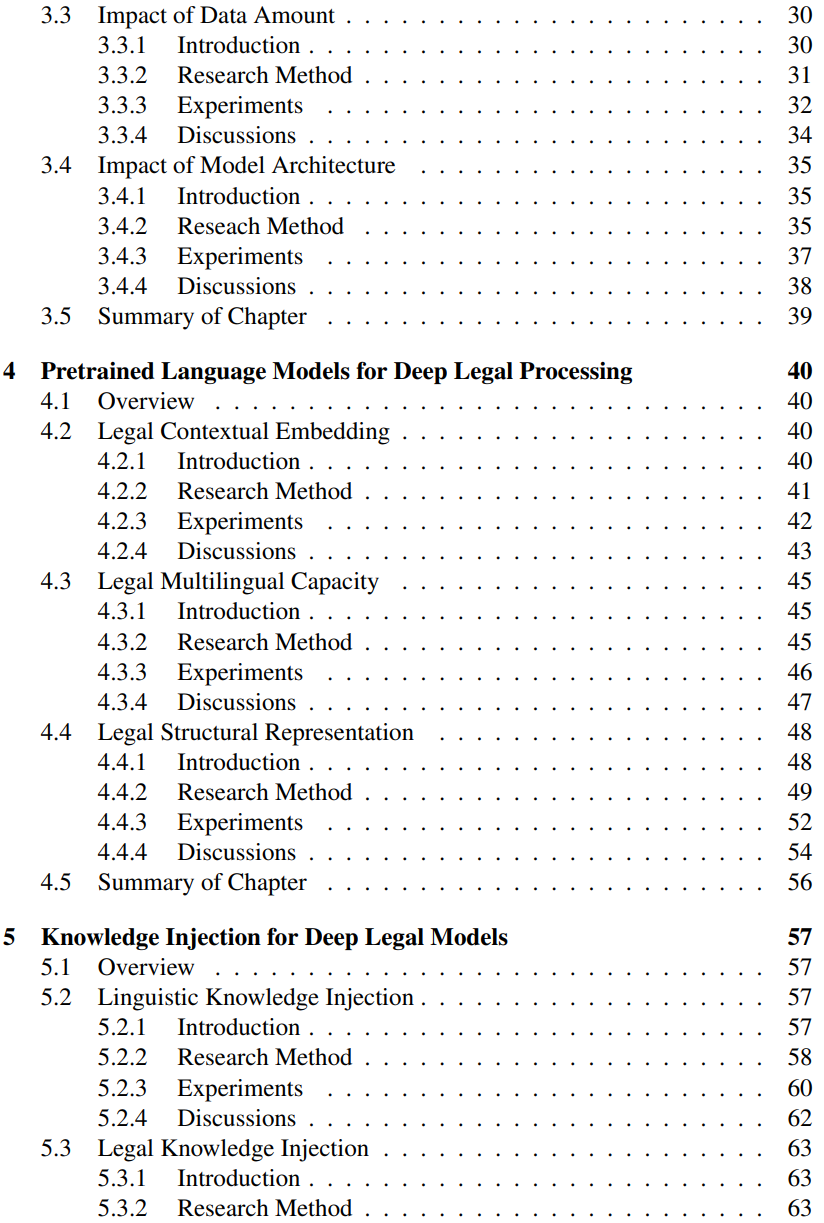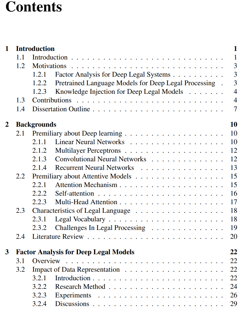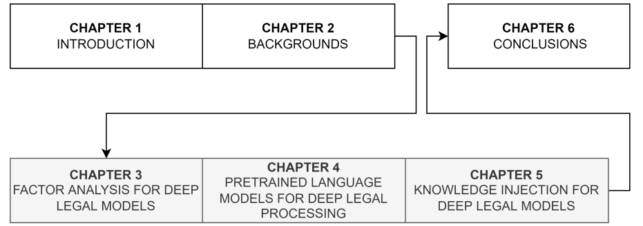 论文的大纲如图 1.2 所示。首先,我们要确认深度学习模型执行法律任务的能力,这通常需要专业知识。我们分析了数据表示、数据量和深度学习模型架构的影响。这一确认是探索深度法律处理知识的第一步。之后,我们进一步发现法律数据的哪些特征可用于预训练强法律语言模型,这是最近在自然语言处理中取得许多良好成果的多头注意力网络家族。在回答这个问题时,会涉及到法律嵌入、法律多语言能力和法律结构表示。最后,我们研究了将知识注入神经网络以获得该领域模型的性能和可解释性的可能性。研究语言知识、法律知识和自学知识来回答这个问题。