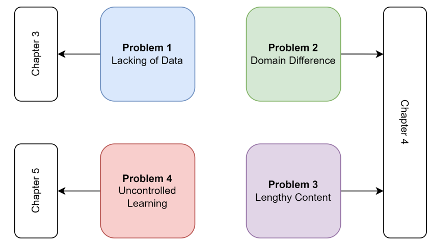 论文的主要贡献包括发现和解决了法律领域深度学习系统的4个常见问题,即数据缺失、领域差异、内容冗长和学习不受控制,如图1.1所示。除了非架构解决方案外,本文提出的模型都利用了注意力机制。论文还表明,如果没有适当的方法,注意力模型的力量可能会被浪费。这在注意力CNN、预训练语言模型和 Paraformer 部分中得到了特别证明。