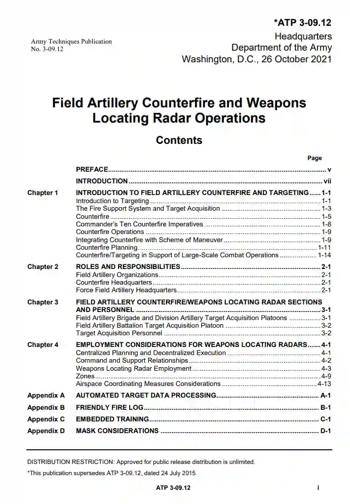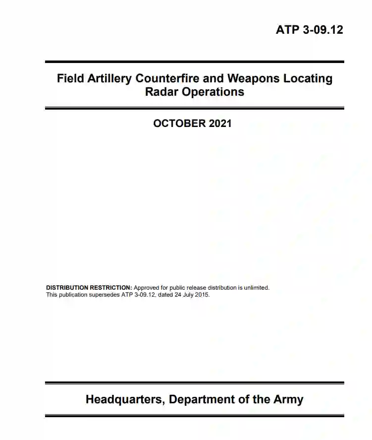 ATP 3-09.12分为四章和十一个附录。 第1章 野战炮兵反击和目标定位简介。 第2章 角色和责任。 第3章 野战炮兵反火力/武器定位雷达部门和人员。 第4章 武器定位雷达的使用考虑因素。 附录A 自动化目标数据处理。 附录B 友军射击日志。 附录C 嵌入式训练。 附录D 面具的考虑因素。 附录E 支持要求。 附录F 工具和程序。 附录G 火箭炮迫击炮(RAM)的警告。 附录H AN/TPQ-53武器定位雷达系统特性。 附录I AN/TPQ-50武器定位雷达系统特性。 附录J AN/TPQ-36武器定位雷达系统特性。 附录K 目标获取表。
