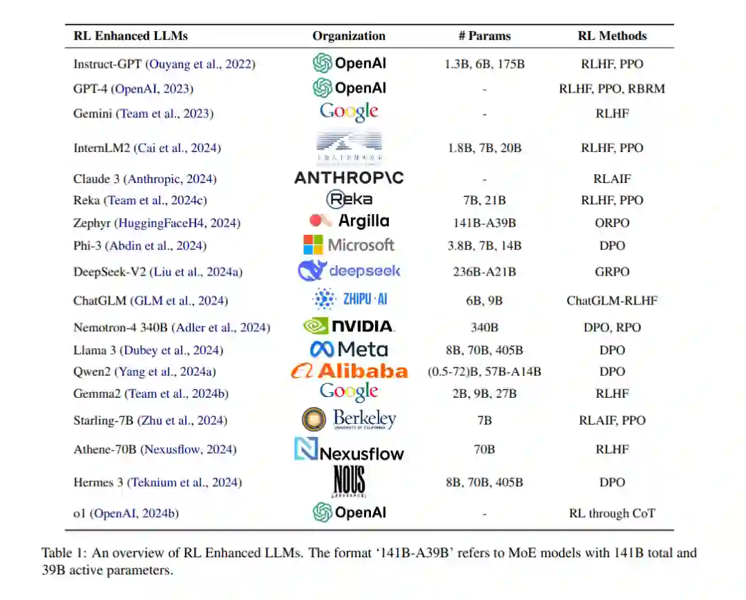 在这一部分,我们将详细描述每个模型,首先简要概述这些强化学习增强的大型语言模型,并解释强化学习如何在它们的后期训练过程中应用。有关这些强化学习增强的LLMs的概览见表1。