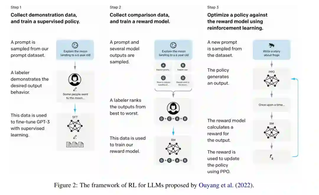 在强化学习(RL)中,有六个关键组件:代理(Agent)、环境(Environment)、状态(State)、动作(Action)、奖励(Reward)和策略(Policy)。要将RL应用于微调大型语言模型(LLMs),第一步是将这些组件映射到LLM框架中。 LLMs在预测下一个词元(next-token prediction)方面非常高效,它们将一系列词元作为输入,并根据给定的上下文预测下一个词元。从RL的角度来看,我们可以将LLM本身视为策略(Policy)。当前的文本序列代表状态(State),根据这个状态,LLM生成一个动作(Action)——即下一个词元。这个动作会更新状态,形成一个新的状态,其中包含新增的词元。在生成完整的文本序列后,使用预训练的奖励模型来评估LLM输出的质量,从而决定奖励(Reward)。 图2 展示了Ouyang等人(2022)提出的LLM强化学习框架。Ouyang等人(2022)首先使用通过监督学习训练的指令微调模型,使其能够生成结构化的响应。接着,Ouyang等人(2022)应用了以下两个步骤: 步骤1:收集比较数据并训练奖励模型