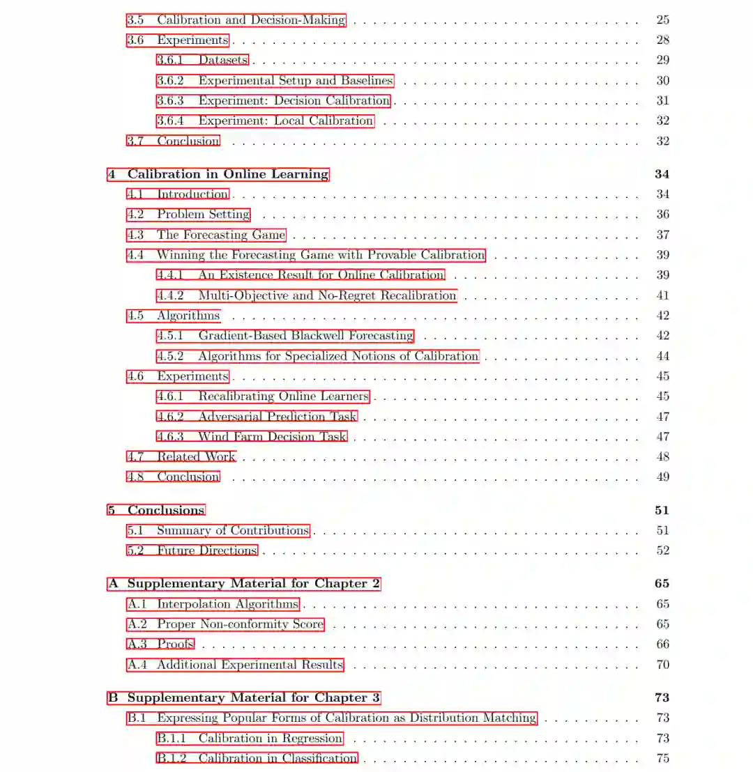 在高风险环境中部署机器学习系统时,预测结果将直接影响从医学诊断到基础设施管理以及科学发现等关键决策,因此,对不确定性的可靠量化至关重要。本文围绕概率预测开展研究,重点在于通过实现校准(calibration)来提升不确定性估计的可信度——即预测概率应与事件的经验频率保持一致,例如:置信度为90%的区间应有90%的概率覆盖实际观测结果。 我提出了贯穿整个模型生命周期的多种干预方法,用于提升模型的校准性能:包括在训练阶段设计优化目标以鼓励校准、在后处理阶段修正误校准的方法,以及在部署阶段于非平稳环境中自适应保持校准的在线技术。 论文第一部分聚焦于后验重校准(post-hoc recalibration)。我提出了模块化保序校准(modular conformal calibration)这一通用框架,它涵盖并扩展了现有的后验不确定性量化方法,如保序回归(isotonic regression)和保序预测(conformal prediction)。该框架明确了重校准策略的设计空间,并为使用这些策略重校准后的任意模型提供有限样本下的校准保证。这一框架使实践者能够在计算开销、概率解释性、确定性行为与校准强度之间进行权衡。 第二部分关注训练阶段的校准策略,目标是在保持预测“锐度”(即预测结果的自信度与信息量)的同时增强模型的校准性。我提出了一类可微分的校准度量,可作为正则化目标嵌入到训练过程中,使校准性与锐度得以联合优化。这些目标函数覆盖了许多用于回归与分类任务的主流校准指标,这些指标此前往往仅在训练后进行施加。该方法还支持任务定制的校准目标,使得模型的不确定性估计在统计上保持一致性,并能够契合下游决策场景的实际需求。 第三部分探讨了分布漂移(distribution shift)下的校准问题,这是现实部署中的核心挑战之一。我研究了一个在线预测设置,其中数据可能随时间演化或由对手策略生成。基于Blackwell可达性理论(Blackwell approachability theory),我提出了一种通用策略,可在最小假设下针对任意观测序列实现校准保证。该框架支持多种校准概念,包括分布校准与决策校准,并提供基于oracle的方法与可计算的算法。我进一步提出了基于梯度的松弛算法,在扩大适用范围的同时,部分放宽了理论保证。实验证明,这些方法在保持校准预测的同时,对比专家预测器可获得渐进无悔(vanishing regret)。 总的来说,本论文提出了一套系统化的、理论支撑的策略,用以提升概率模型在整个开发流程中的不确定性估计灵活性与可靠性。通过在模型生命周期的各阶段强制实现多种形式的校准,本文为实际应用中高风险决策提供了稳健可信的模型支持。