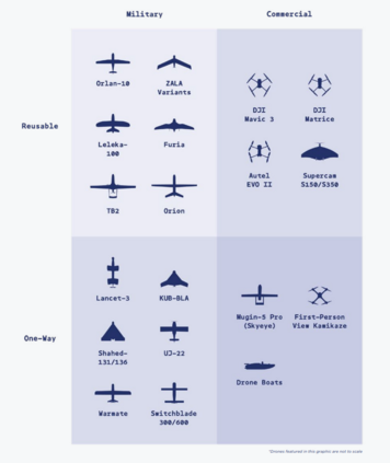 - 无人机提供了经济实惠的空中力量,但它们并未取代传统空军,也无法获得空中优势。大多数空军的核心任务是获取和维持空中优势,即在空中开展行动的自由,包括抵御敌方空中攻击和开展空对地进攻行动。获取空中优势通常需要通过空对空交战或攻击空军基地以及压制或摧毁地面防空系统来摧毁对方空军。曾发生过几次无人机狗斗和神风特攻队无人机袭击俄罗斯轰炸机空军基地的事件,但这些任务很少。俄军在前线附近进行了有效的无人机压制敌方防空(SEAD)行动,但并未摧毁乌克兰的远程防空系统。由于双方都没有取得空中优势,因此都依赖于对峙攻击,而不是直接攻击纵深目标。