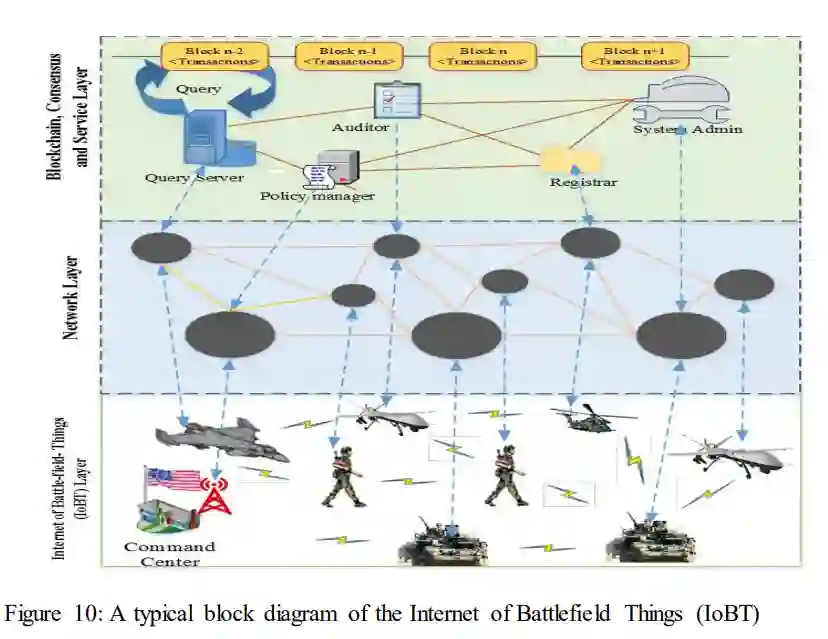 新兴的物联网(IoT)技术正在成为社会的重要组成部分,以提高现有基础设施的运行效率。通过先进的传感器和执行器,可以从各个端点收集环境数据,并用于分析以采取必要的控制行动。特别是,现代战场配备了先进的物联网武器、可穿戴设备和车辆,以提高军事任务中决策能力的准确性。虽然战场上的操作设备会受到存储、处理能力和联网能力等资源的限制,但这些设备之间交换数据的安全性对任务的成功至关重要。战场物联网(IoBT)的大规模、异构性和分布式特点为实现实用有效的安全解决方案带来了挑战。有人提出利用区块链的防篡改分类账平台和技术来应对这些挑战。然而,物联网网络中产生的大量数据需要实时验证和核实,以验证与任务相关的数据。因此,核心区块链基础设施必须有足够的能力满足这些需求。
